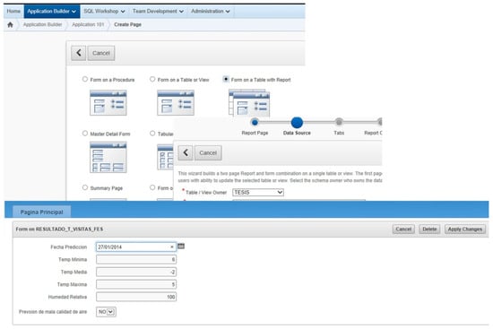 Oracle application express (Oracle APEX) is Oracl’s primary tool for developing Web applications with SQL and PL/SQL. Using only a web browser, one can develop and deploy professional Web-based applications for desktops and mobile devices. To develop an application with APEX, one just has to open a web browser to connect to it. Once inside the development area, one can access various wizards that generate automatic web pages of types, REPORT and FORMS, based on the tables of origin. By selecting the table, the FORM type pages are created with all the table fields and buttons to insert, modify and delete the record. In Figure 7 several screens of the wizards that generate web pages are shown.