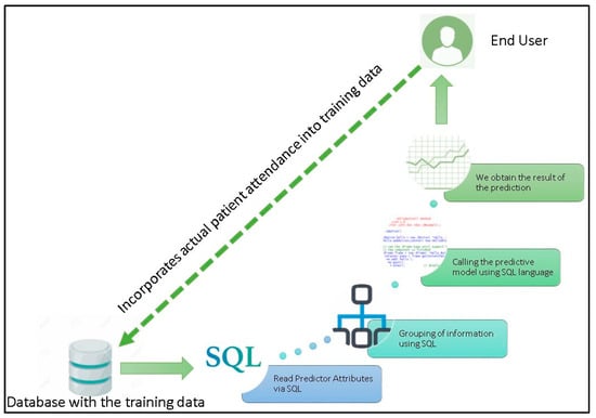 It was essential for our decision support system to learn [] so that it adapts to changes in the use of healthcare services. To do this, they are published in a field in the application in which the user can manually insert the actual data of patients which attended the healthcare centres, which ensures inductive supervised learning. Invoking a SQL statement, the models are generated with actual data inserted, Figure 8. The syntax to regenerate the model again can be seen in the Supplementary Materials.
