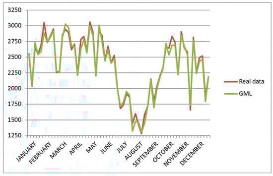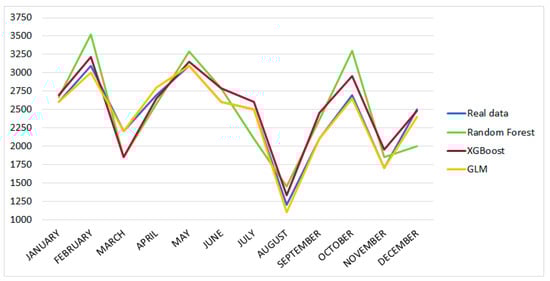 It was confirmed that the three selected algorithms offered a higher predictive accuracy. As seen above, the GLM gave the best result with an absolute error of 2.11% compared to the 2.31% error of the SVM with a linear kernel or the 4.22% error of the SVM with a Gaussian kernel. A visual analysis of the results of the Random Forest and XGBoost algorithms is shown in Figure 11, where it can be seen that GLM fits the predictions in all months of the year.
