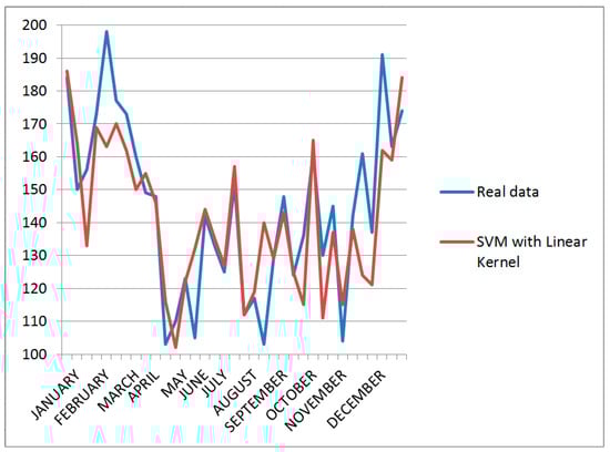 Then, the three models were validated by comparing their predictions with the actual data of 2018. In order to perform this validation, the absolute error of the model was calculated, considering this as the difference between the predicted data and the actual data. The GLM algorithm results had an error of the 2.11% versus the 2.31% of the SVM with a linear kernel and 4.22% for the SVM with a Gaussian kernel. Figure 9 shows the distribution of data making the prediction model with the actual data. The similarity between both distributions is very significant. The good predictive ability of the GML algorithm to predict the number of patients attending the health centre on weekends and holidays was confirmed. The graph shows a generally good fit despite the large variation in the number of visits between the winter and summer months. However, a more detailed analysis of the graph showed a greater disparity in the month of October and another between the months of March and April. This may be due to the fact that the flu vaccination campaign usually starts in October and this factor was not taken into account directly as another factor in the training data. As for the months of March and April, the period for prescribing medication to treat the symptoms of spring allergies usually begins here, a fact that was not been explicitly considered as a factor, although it was indirectly included in this increase in the number of visits to the health centre.