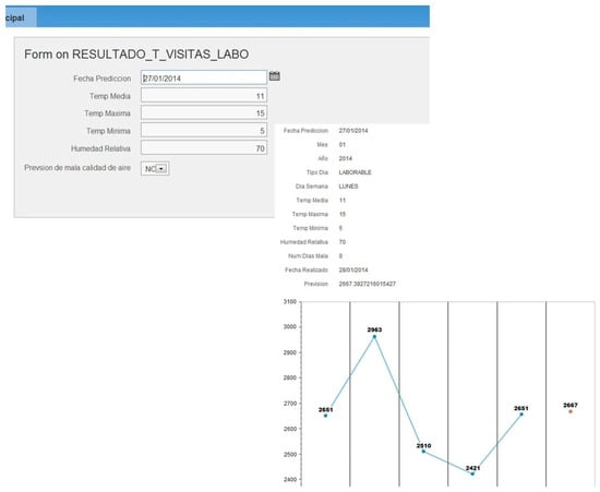 Finally, another screen to display the result of the decision support system was designed. To do this a wizard was used again relying on the same table of results. To improve the interface and assist the manager, a graph is generated in which historical data are shown, which helps to build the model (number of patient visits in previous years on a similar day). To do this a graph type component is needed and a scheduled SQL to group the data. The SQL that would generate the graph is shown in the Supplementary Materials.