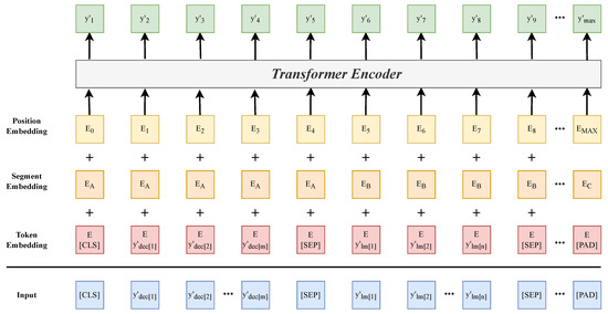 The generated sentence pairs () are processed in token embedding, segment embedding, and position embedding layers. The sum of these processes is introduced as an input to the transformer encoder network (Equation (12)). (Figure 4).