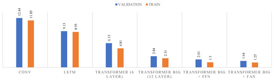 The parameter sizes of the created models are given (Table 5). A perplexity score was used to stop the training. If the perplexity score on the validation test set did not decrease for 10 epochs, the training was stopped. The final perplexity scores of the models in the validation and training datasets are given in Figure 5.