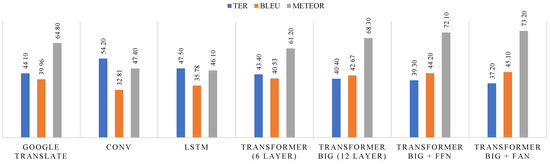 TER, BLEU, and METEOR scores of all models created were calculated separately. In addition, the test set was translated using google translate. Evaluation scores of this translation were also calculated. All results are shown in Figure 6.