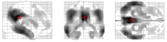 Sample output of SPM12. A group-wise comparison was performed on FDG-PET scans of AD patients and healthy controls, and the results were compared by t-testing. Regions of statistically significant differences between the groups ( with family-wise error adjustment) are shown as dark clusters on the white glass brain. Red arrow points to the global maximum.
