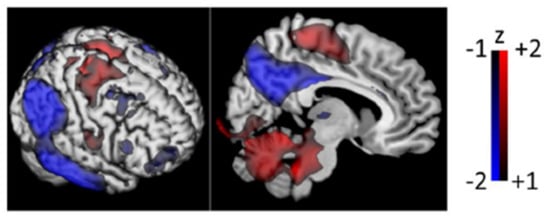 Performing PCA on FDG-PET images reveals disease-specific patterns in AD compared to healthy controls. PCs were obtained and eight of the first 10 were combined via stepwise linear regression to obtain the visualization seen above. Figure shows outer exterior (left) and medial exterior (right) surfaces. Images scaled according to mean z-score and standard deviation of whole images for the purposes of visualization. Reprinted/adapted with permission from Ref. [85]. Copyrights under Creative Commons Attribution 4.0 International License (http://creativecommons.org/licenses/by/4.0/, accessed on 1 October 2022).