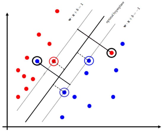 where is a vector normal to the hyperplane and b is a bias. All vectors having a magnitude or belong to the positive and negative classes, respectively, but those with the special property are designated support vectors. The support vectors determine the placement of the hyperplane, and the SVM optimization algorithm will attempt to construct the hyperplane using the support vectors that are as far away from one another as possible, as seen in Figure 4 and visualized in Figure 5. This is a minimization problem that has the form:
