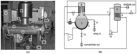 Image (a) and simplified layout (b) of the low-temperature low-pressure vapor distillation laboratory plant: (1) compressor; (2) heating envelope (hot side); (3) ebullition chamber; (4) refrigerant under-cooling heat exchanger (hot side); (5) thermostatic valves of expansion; (6) condensation chamber (cold side); (7) Venturi ejector creating the low-pressure (with sampling open); (8) distillate tank; (9) distillate cooling (cold side); (10) centrifugal pump; (11) inflow electro-valve from whey tank (not shown) and (12) outflow discharge hand-valve to collecting concentrate tank (not shown).