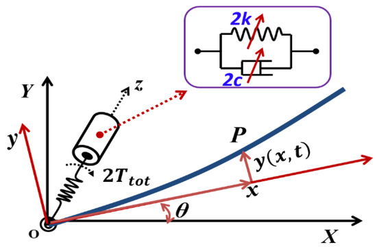 Consider a coupling system of dual joints and a flexible beam in a horizontal plane, which can be found in Figure 2. Figure 2 illustrates the structural deformation diagram of the flexible plate, where the two-dimensional plate is simplified into a one-dimensional beam model. In fact, not only is the torsional rigid body motion shown, but also the bending deformation of the plate based on the torsional rigid body motion is demonstrated. The body-fixed coordinate is introduced, aiming to efficiently depict the local deflection of the beam; the origin is at the joint. Then, in the inertial frame, the position of a point on the deformed centerline of the beam can be expressed as: