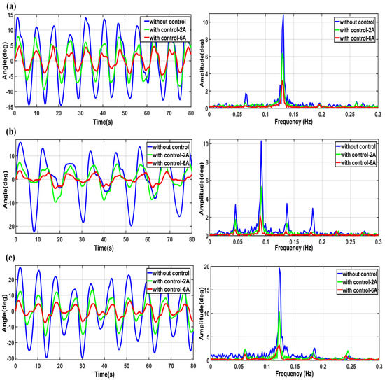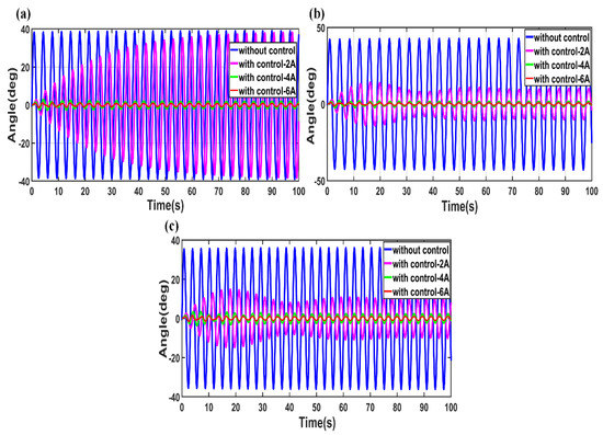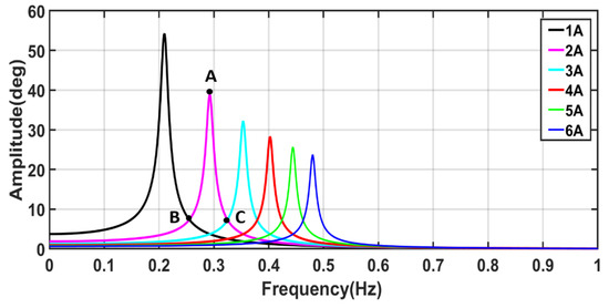 Furthermore, as shown in Figure 4, we see the external excitation frequency of 0.266 Hz (point B) and 0.316 Hz (point C) near 0.292 Hz (point A). In Figure 6b, the external excitation frequency reaches 0.266 Hz, and the angle of magnitude lowers from 42.78° (0 A) to 9.904° (2 A), 1.61° (4 A) and 0.88° (6 A). In Figure 6c, the excitation frequency reaches 0.316 Hz, and the angular amplitude lowers from 35.93° (0 A) to 9.964° (2 A) to 2.33° (4 A) and 0.98° (6 A). It is important to note that, although the points B and C are not at the resonance peak, the increase in joint torsional stiffness causes the system resonance frequency to shift (or increase), causing the points B and C to produce a certain vibration isolation effect, as shown in Figure 6b,c.