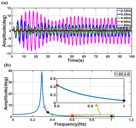 With the joint torsional stiffness being changed at the resonant peak, the vibration suppression effect is most obvious. Therefore, it can be supposed that the exciting frequency is the first natural frequency of the system when the joint receives DC-2 A power. Figure 6a shows the time domain response of the system when the external excitation frequency is 0.292 Hz, corresponding to the point A in Figure 4, and when the joint torsional stiffness is 0.7686 N · m/rad in Table 2. In Figure 6a, the exciting frequency is the first natural frequency of the system under DC-2 A, the resonance appears, and then the angle amplitude reduces from 38.89° (0 A) to 1.88° (4 A) and 0.97° (6 A), and the vibration isolation can be realized by the frequency-shifting phenomenon.
