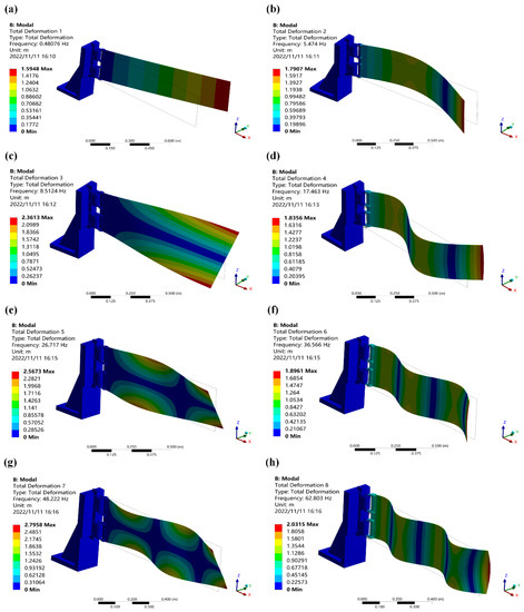 Mode shape of the system: (a) 1st order, (b) 2nd order, (c) 3rd order, (d) 4th order, (e) 5th order, (f) 6th order, (g) 7th order and (h) 8th order.
