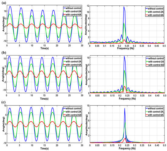 Vibration control experiments based on the same frequency yet diverse amplitude excitations at 0.23 Hz. (a) interference amplitude of 11.71°; (b) interference amplitude of 10.43°; (c) interference amplitude of 9.23°.