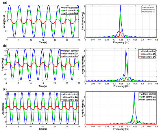 Comparative results of vibration control: (a) 0.244 Hz; (b) 0.282 Hz; and (c) 0.343 Hz.