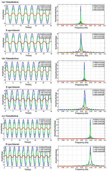 Three groups of experiments were performed at the same frequency yet diverse amplitudes. The semi-active vibration control effects are shown in Figure 11, which are summarized in Table 3. The disturbance frequency reaches 0.23 Hz with a disturbance amplitude of about 9~12°. After the dual joint semi-active control, the vibration reduction effect of 14.56–19.64 dB can be achieved.