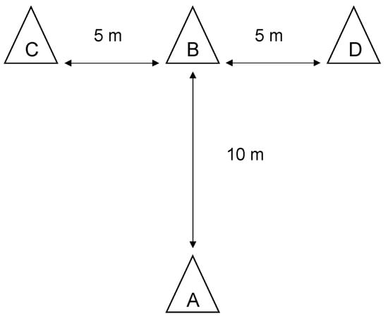 One photoelectric cell (Microgate Polifemo Radio Light, Bolzano, Italy) [17] was used as the instrument placed at the start of the drawn T. The t-Test was used, following the protocol with certain modifications made by Asencio-Vicedo et al. (2020) [40]. This test consists of a circuit at maximum speed in which a letter T has to be drawn and delimited with cones in 4 points (Figure 1). The player started the test with both feet 0.5 m behind the starting line (A) and sprinted in a straight line 10 m to point B. Once the cone was reached, the player shuffled to the left and 5 m to the next cone (C), after which the player shuffled to right 10 m to touch the cone on the other side (D). Then, shuffled to the left 5 m back to return to the central cone (B), in that moment, players ran backward until they passed the starting line (A). The t-test measures different types of displacement. Lateral and backwards. In futsal, there are not only linear movements, but also lateral movements (covers, and supports) and backwards movements (retreats and pivot play). Each subject was allowed a minimum of 3 min between two attempts to ensure adequate recovery. The measure obtained to establish correlations is the best time in seconds of three attempts.