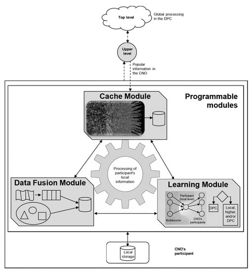 This dimension performs intelligent processing of big data through three programmable modules or components. These components are located at the CNO’s architecture levels (see Figure 2). Programmable modules mainly use the participant’s local data. Therefore, the modules require low-end infrastructure unlike the DPC. Figure 3 shows the interrelation of the three programmable modules described below: