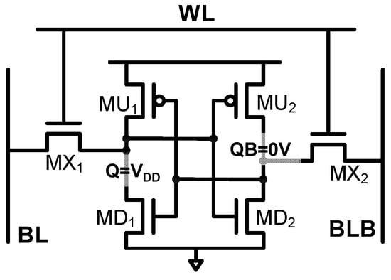 In the memory of the digital circuit, SET can change the digital value at the storage nodes, leading to data flipping (0 → 1 or 1 → 0). This logical value change by SET is referred to as single event upset (SEU). In the conventional 6 T SRAM cell shown in Figure 1, the storage nodes Q and QB are not only the drains of access transistors (MX1,2) and pull-down transistors (MD1,2), which are nMOSFETs, but also are the drains of pull-up transistors (MU1,2), which are pMOSFETs. Thus, the Q and QB nodes are exposed to both polarities of SET, 0 → 1 and 1 → 0. For example, when Q = VDD and QB = 0 V, which means that the value of “1” is stored, an amount of charge can be collected to result in 1 → 0 SET at Q node. This makes the QB node change from 0 V to VDD accordingly, so the memory cell state is changed into the value of “0”, which means that the data are flipped erroneously. To enhance the robustness to SEU, there have been several radiation-hardening design techniques.