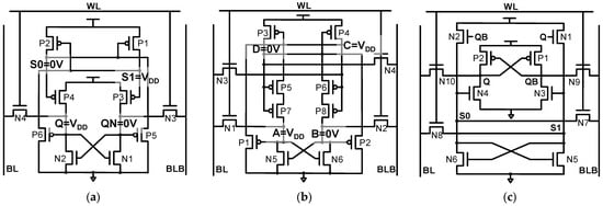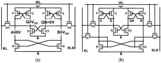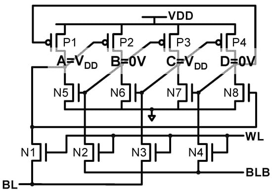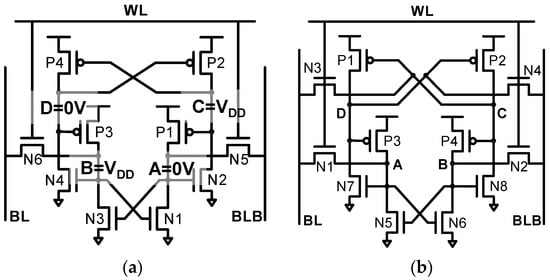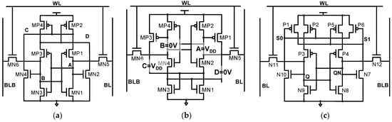To mitigate the write ability problem of the Quatro-10 T cell, two transistors are additionally used and a write-enhanced Quatro-12 T cell (WE-Quantro-12 T) is proposed [], as shown in Figure 3b. Through the two newly added access transistors, N7 and N8, the nodes C and D can also be connected to bit-line pairs. Thus, for the previously mentioned data “0” write case, the node D can be easily pulled up to turn off P3. This significantly enhances the write ability. However, as in Quatro-10 T, WE-Quatro-12 T does not have error tolerance for the 0 to 1 flip of the nodes A and B.