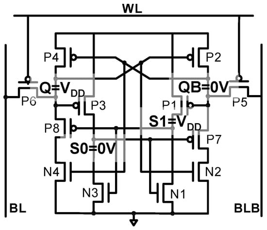 Figure 6 shows a schematic of the radiation-hardened-by-design 12 T SRAM cell (RHBD-12 T) proposed in []. The key structural feature of RHBD-12 T is that no nFET diffusion nodes are connected to Q and QB by using pFET access transistors. Thus, 1 to 0 upset is not generated at the Q or QB nodes, and only 0 to 1 upset occurs, which is recoverable. For example, when the datum “1” is stored by Q = S1 = VDD and QB = S0 = 0 V, as shown in Figure 6, QB can be temporarily raised by SEU, which turns on N4. However, P8 is in the off state; thus, no other storage nodes are affected. The raised QB is pulled down back to its original state by the P7-N2 path.