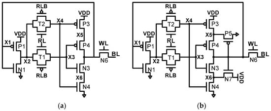 Figure 9a,b show the schematics of the radiation-hardened dynamic 11 T and 13 T (RHD-11 T and RHD-13 T) []. As with RHBD-11 T and RHBD-13 T, the single-ended BL is used and the isolated nodes are used with refresh signals to enhance the error resilience. RHD-11 T has full immunity to single node upset through the use of the stacked inverter P3-P4-N3-N4. Unless X3 and X4 are simultaneously upset, X1 keeps the original value, so X2 is unaffected as well. As a result, the data status can be recovered by the following refresh operation. However, if X3 and X4 are both changed, X1 and X2 are changed subsequently, which results in the data flip. This problem is mitigated in RHBD-13 T through applying the Schmitt trigger inverter, to cause the inverter to trip more severely.
