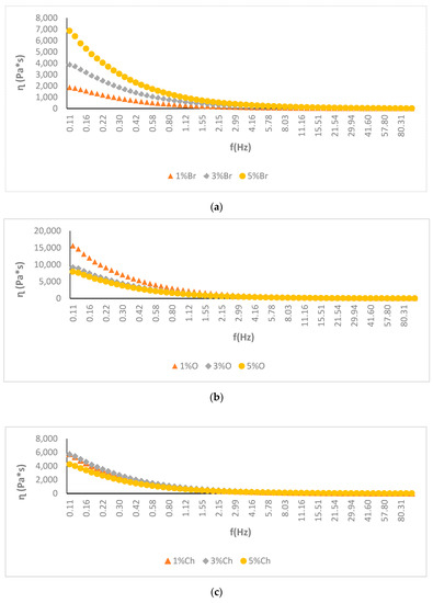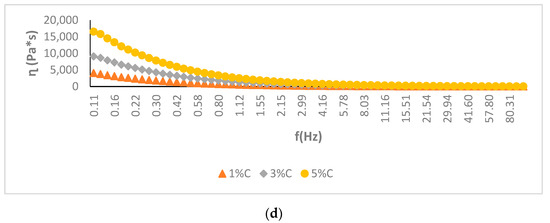 Figure 1a–d presents the measurements of the viscosity (ղ) related to frequency (0.1–100 Hz) of the desserts with the addition of a different amount of dried vegetable powders ((a)—beetroot; (b)—onion; (c)—champignon; (d)—carrot). Depending on the amount and type of dried material added, the change in the viscosity of individual products was observed.
