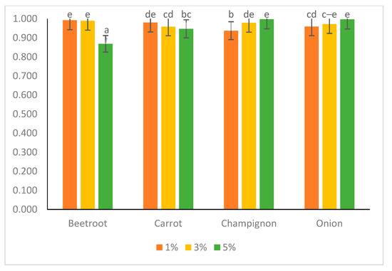 The water activity of different samples of fat-free dairy desserts with vegetable powders decreased significantly (p < 0.05) in products with beetroot and carrot powder addition, along with higher concentrations. The opposite tendency was noticed in products with the addition of champignon and onion powder. The highest values (p < 0.05) were noted in the samples with 5% onion (0.996), champignon (0.997), 1% (0.992), and 3% of beetroot (0.989), respectively. The lowest water activity was noted in the dairy dessert with 5% beetroot powder (0.868). To describe a dairy product as shelf-stable, its water activity should be as low as possible (>0.85). Sometimes, even when this requirement is fulfilled, this product often has a relatively short storage life [51]. Aportela-Palacios et al. (2005) tested the features of yogurt fortified with calcium and fiber. They noticed that the product’s water activity decreased due to the higher amount of solids in the product [52]. The opposite tendency in the two series of tested products was observed (champignon and onion), which may be related to the ability to bind water by vegetable powders used in the experiment.