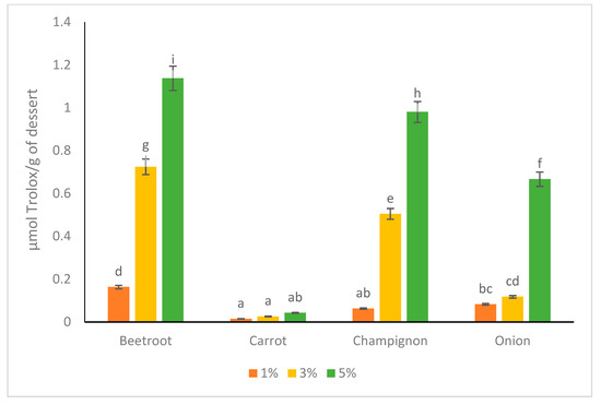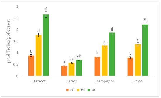 Using the DPPH method, the ability of the antioxidants to donate hydrogen radicals or an electron to the stable DPPH free radical was measured. All tested products could reduce radical DPPH into DPPH-H. Along with the amount of added powder, an increase in the value (μmol Trolox/g of dessert) was noted (beetroot, champignon, and onion addition) (Figure 4). The value increase in samples with dried carrots was insignificant compared to other products (p > 0.05). The highest measurements were observed in dairy desserts with beetroot powder (0.16–1.14 µmol Trolox/g of dessert) and the lowest in the samples with carrot powder addition (0.082–0.67 µmol Trolox/g of dessert). The DPPH value of the dessert prepared without adding dried vegetable powder (9% WPC80) was 0.27 ± 0.25 µmol Trolox/g [22]. It suggests that a 1% addition of vegetables may not be sufficient to improve the capacity to neutralize DPPP radicals in any of the vegetable-enriched dessert. A 3% additions significantly improved antioxidant potential in the case of beetroot and button mushroom (not onion and carrot, though). When 5% addition was applied, every dessert (except carrot-enriched) had increased antioxidant capacity in the following order: beetroot > champignon > onion. Mohamed et al. (2014) tested yogurt fortified with dietary fiber. They added dried grape pomace (1–5%) and found that the higher amount of added fiber increased scavenging activity in the final product [36], which is consistent with our results.