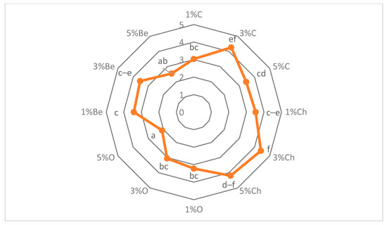 Organoleptic evaluation of fat-free dairy desserts enriched with different amounts (1, 3, or 5%) of dried vegetables (C—carrot; Ch—champignon; O—onion; Be—beetroot). (Scale: 1–5 points; 1 = extremely dislike, 5 = extremely like). a–f Means with different superscripts are significantly different (p < 0.05, Tukey’s HSD test).
