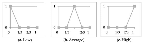Taking the composition of the “degree of auspiciousness” with the functions presented below, we accordingly obtain new linguistic variables: “the value of the parameter is low” (L); “average parameter value” (M); “high parameter value” (H). Note that these kinds of linguistic variables are often used in technical systems. An even greater number of gradations are also often considered: below average, above average, close to zero, etc.