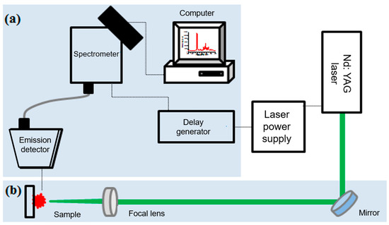 As shown in Figure 1, the LIBS system is composed of two main parts, which are the laser generation part, Figure 1a, and the signal collection part, Figure 1b [18]. In the laser generation part, the laser pulse was focused to ablate the target sample, and the plasma was then induced from the ablated sample. The laser source was an Nd-YAG (Litron Lasers Inc., Rugby, UK) operating at a wavelength of 1064 nm and an energy of 30 mJ over a pulse duration of 8 ns with a repetition rate of 1 Hz in Q-switch mode. A 100 mm focal length lens (Thorlabs Inc., Newton, NJ, USA) was used to focus the beam onto the sample surface. In the signal collection part, the spectrometer collected the emitted signals when the excited electrons from atoms and ions came back to the ground state. The light from the induced plasma was focused through a plano-convex lens with a 40 mm focal length lens to a fiber-optic bundle. A fiber-optic cable with a 1 mm diameter was installed at an angle of 45° with respect to the normal direction of the sample surface. The optical fiber was directly connected to the slit entrance of a spectrometer with four-channel charge-coupled devices (J200, Applied Spectra, Fremont, CA, USA). The spectrometer had a spectral range of 180–884, a spectral resolution of 0.1 nm, and a signal-to-noise ratio of about 250:1. A digital delay/pulse generator (Stanford Research Systems, model DG535) was used to control the delay times when the data were recorded. The software program Aurora was used for data acquisition. The integration time was set at 1.05 ms [19].