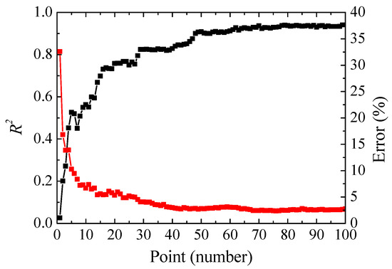 The coefficient of determination, R2, and the error vary according to the number of measured points. As the number of measured points increases, the coefficient of determination value tends to become closer to 1 and the error decreases. In Figure 3, the coefficient of determination was above 0.9 from 48 points at a wavelength of 247 nm in C. When the coefficient of determination is above 0.9, the reliability of the data can be considered to be high. To eliminate the suspicious data, the maximum and minimum values were subjected to Grubbs test to determine whether the value was an outlier.