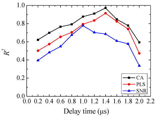 The coefficients of determination, R2 with various delay times for the CA, PLS, and SNR methods.
