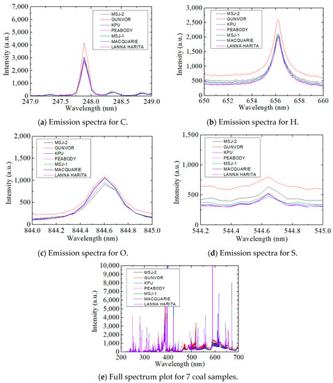 Figure 5 shows the seven emission spectra for seven coal samples at 247.7 nm for C, 656.2 nm for H, 844.6 nm for O, and 544.65 nm for S. All four emission lines were clearly identified from adjacent emission lines, and they were obtained with a delay time of 1.4 μs. The wavelengths of 247.7, 656.2, 844.6, and 544.65 nm are known to be characteristic wavelengths for identifying the existence of carbon, hydrogen, oxygen, and sulfur, respectively, in coal samples. In Figure 5a, the carbon emission spectrum for Gunvor presented the maximum intensity due to the highest C concentration (74.4%) among the seven coal samples, as shown in Table 2. In Figure 5b, the highest hydrogen emission spectrum appears to occur in the Gunvor sample. However, the base signal line for the Gunvor sample is shifted a little bit. Considering this, the magnitude of the hydrogen spectra for the seven samples is almost identical. Compared to other components such as hydrogen and sulfur, the maximum intensity of the carbon spectrum was much higher than those of the other components. In Figure 5e, the average value of 100 spectra from the seven different coal samples is shown as a full spectrum obtained from the spectrometer.