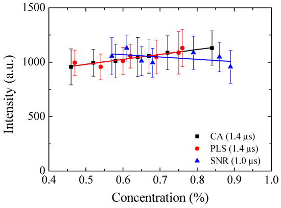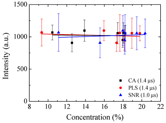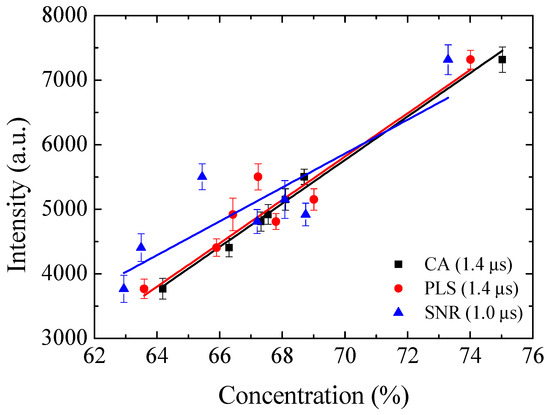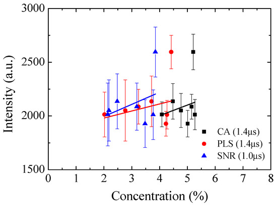 In Figure 6, the correlation between the intensity of the LIBS signal at 247.7 nm and the concentration of carbon in coal samples was analyzed with delay times of 1.4 μs for the CA and PLS methods and 1.0 μs for the SNR method. The signal intensity at a wavelength of 247 nm, which is a representative spectrum of the atomic carbon from the LIBS spectra data, was selected for estimating the carbon concentration in the samples. Because the used coal samples were composed of over 60% carbon, the intensity of the carbon signal was larger than those of the other remaining elements. The carbon signal could be easily distinguished from the other elements. Depending on the coal sample, the carbon concentration varied from about 65 to 75% and the signal intensities were proportional to the carbon concentration. The R2 for the CA, PLS, and SNR methods was 0.98, 0.92, and 0.65, respectively. The magnitude of the error bars in the carbon samples were relatively small compared to that of the other elements, with a maximum of 4.3, 5.1, and 5.7% from the mean value for the CA, PLS, and SNR methods, respectively. This was caused by the large quantity of carbon in the coal samples.