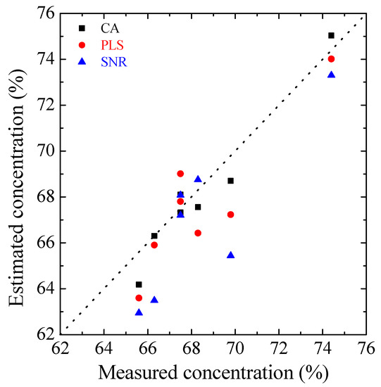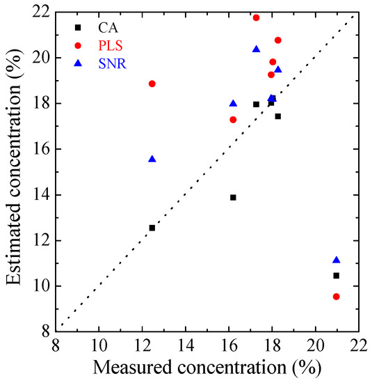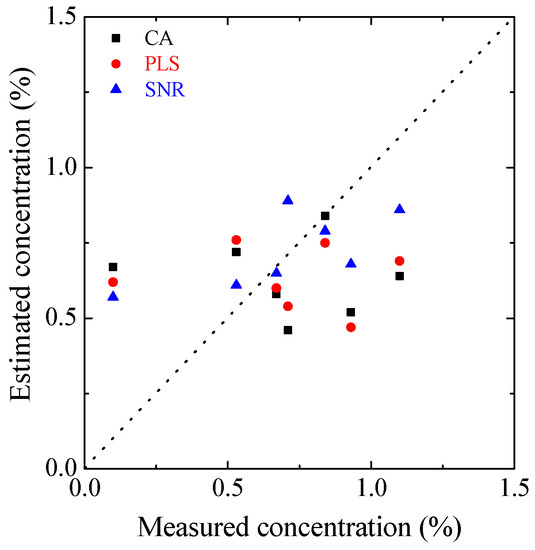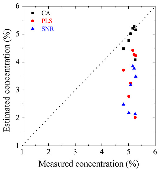 In Figure 11, the relationship between the estimated concentration of hydrogen using the LIBS signal intensity and the known concentration of hydrogen in the coal sample is depicted. As shown in Table 1, the hydrogen concentration in the coal sample was between 4.8 and 5.2%. The LIBS signal peak intensity difference with changes in the concentration of hydrogen in the sample may not be clear, and this affects the estimation accuracy. The peak intensity itself was small when the concentration of the target element in the sample was small. This increased the effects of the baseline noise. For that reason, the estimation accuracy for the hydrogen concentration using the PLS and SNR methods was low compared to that of the CA method. Overall, the hydrogen concentration in the coal sample was underestimated.