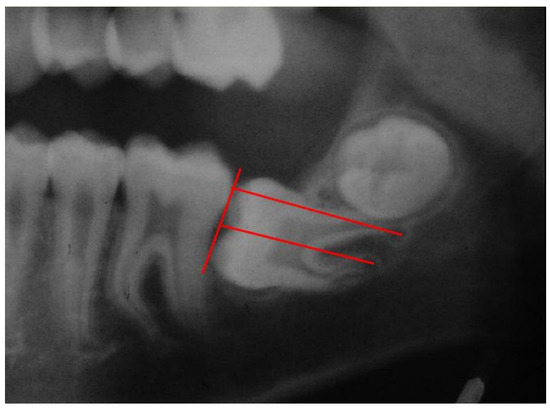 An impacted molar remains unerupted in the alveolar bone or in the body of the mandible (corpus mandibularis) beyond the time at which it normally erupts. Crowding and arch length deficiency in the posterior region of the mandibular arch have been suggested as important local factors causing MM2 impaction [6,14]. Our findings, however, do not fully support that theory, as will be explained later in the discussion.