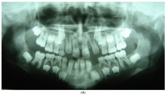 This may also support our theory [5,9] that MM2 mesial angulation occurs early, before the third molar bud is developed and even when the third molar is congenitally missing, as presented in the panoramic radiograph of a 12-year-old girl with a mesio-angular impacted right MM2 having a shorter mesial root (Figure 2). This was also demonstrated in a 10-year-old girl with normal erupting-positioned MM2s (Figure 8A), which four years later, at the age of 14 years, presented her right MM2 as mesially inclined, while the third molars were congenitally missing (Figure 8B). That is, the differential MM2 root development and its mesial angulation could probably be the major cause, while the posterior crowding might have been a secondary contributing factor, occurring later and causing the MM2 to become impacted. It has been shown that patients with congenitally missing third molars have fewer problems of crowding or impacting of the MM2 during treatment. Thus, early removal of the third molar relieves the congestion at the end of the lower arch. An early prophylactic approach for interceptive removal of the third molar germ has been suggested. Such extraction of the mandibular third molar germ, before or during orthodontic treatment, could be beneficial because it may facilitate the eruption of the second molar [15]. In 1934, Henry [29] described the enucleation technique at the bud stage of the third molar at an early age (7–9 years) as a simple and relatively atraumatic procedure. This is contrasted by the often difficult extraction of deeply impacted third molars in adults. Similarly, in 1970, Ricketts [30] revisited the enucleation of third molar buds as a prophylactic measure in young children, using electrosurgery.