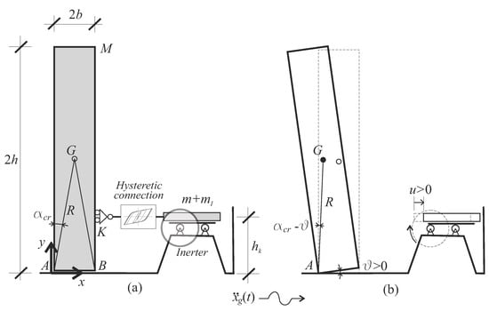 As introduced before, the coupled system studied in this paper and showed in Figure 1a is constituted by a symmetric rigid block, representing a general rigid block-like structure, and an external auxiliary system. Such an auxiliary system is connected to the rigid block through a hysteretic device and is equipped with an inerter. The rigid block has the dimensions , where is the depth orthogonal to the plane of the figure. Figure 1a also shows the parameter that characterizes the geometry of the rigid block, R, which is defined as . Other characteristics of the rigid block are its slenderness and mass , with being the bulk density. In Figure 1a, the critical angle, , represents the value of the rocking angle for which the mass centre G is on the vertical line passing through one of the two base vertices that are identified by points A and B. The position corresponds to an unstable equilibrium condition. A characteristic circular frequency and a characteristic period , given by