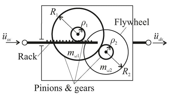 The inerter is a linear mechanical device that develops a resisting force proportional to the relative acceleration between its terminals. The inerter can be modelled as a particular case of the rack–pinion–flywheel device in Figure 2. Such a device consists of two (or more) flywheels of radius and mass , that are free to rotate and connected to a linear rack through a pinion gear mechanism. As in [8,28], the resisting force is given by