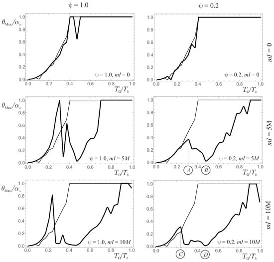 Each frequency–response curve refers to a rigid block with specific geometric characteristics. Such curves have the ratio between and on the horizontal axis and the ratio between and on the vertical axis. The numerical integration of the equations of motion performed to obtain the frequency–response curves are stopped when the absolute value of reaches . Hence, the frequency–response curves have a unitary value when is reached. The first analysis is performed to assess the dynamics of the coupled system to the pre- to post-yielding stiffness ratio and the apparent mass . The frequency–response curves of Figure 3 are obtained for a block with , and for an auxiliary system with , , and . The quantity is the value of the horizontal displacement of point K (see Figure 1a) evaluated when .