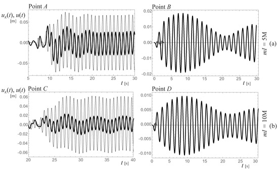 The graphs in Figure 4 show the time histories of the horizontal displacement of the coupling point (thin line) and the displacement of the auxiliary system (thick line). Each graph refers to a different point (from A to D), labelled in different frequency–response curves of Figure 3. In particular, points A and C are located at the left peaks of the frequency–response curves of the coupled system, whereas points B and D are the points of relative minimum in the middle of the frequency–response curves. The time histories of the left column show that the block and auxiliary system move in counter-phase for all values of , as expected from the linearised mode of the coupled system that is here excited in resonance condition (see Section 3.1). The time histories of the right column show that suddenly vanishes, whereas the motion of the auxiliary system manifests the typical behaviour of dynamical systems excited with a frequency close to one of the oscillation frequencies of the system. In these cases, the period of the harmonic excitation is close to the reference period of the auxiliary system. Therefore, the harmonic excitation mostly excites the auxiliary system and has a limited effect on the rigid block.