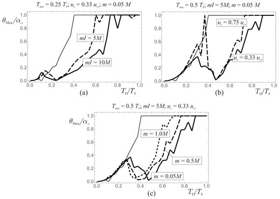Additional analyses are used to show the dependence of the dynamics of the coupled system on the characteristics of the auxiliary system. Figure 5 shows the frequency–response curves obtained for a rigid block with and . The curves of the coupled system (thick solid or dashed lines) in Figure 5a are obtained for , , , and different values of , whereas those in Figure 5b are obtained for , , , and different values of . In the third graph, in Figure 5c, the curves of the coupled system are obtained for , , , and different values of m. In all graphs, the minimum value of the frequency–response curve occurs at a value of close to .