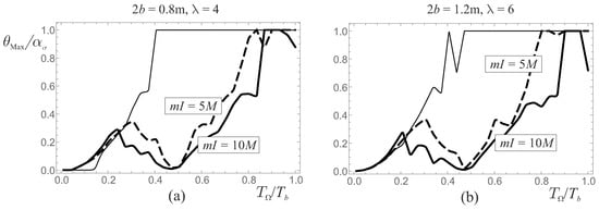 In Equation (20), is the maximum rocking angle of the block in the coupled system that was defined before, whereas is the maximum rocking angle of the corresponding stand-alone rigid block. The seismic analyses are performed on a rigid block with fixed geometric characteristics, using a single seismic record at a time, and varying the following two parameters: