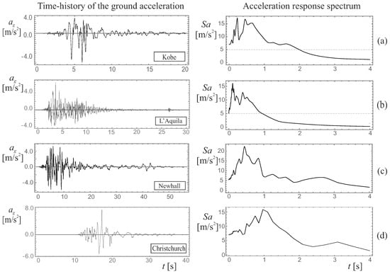 Time histories and pseudo-acceleration spectra of the earthquakes analysed: (a) Kobe; (b) L’Aquila; (c) Newall; (d) Christchurch.