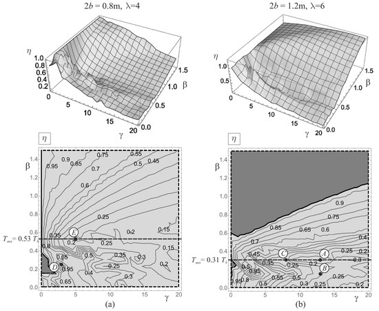 In the gain maps (lower graphs), within the light grey regions, has values smaller than unity, where . Within the dark grey regions, entails that the coupling is not effective in protecting the rigid block. The horizontal dashed lines show approximatively the values of that correspond to the regions of smaller values of observed on the gain surfaces. In general, the coupling improves the seismic behaviour of the rigid block in a significant part of the parameter plane , and the reduction in with respect to goes up to 80% (i.e., ).