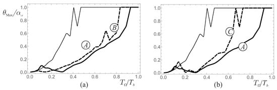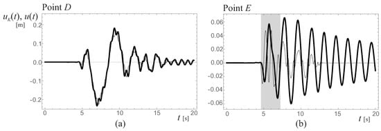 Figure 10 compares the time histories of (thin line) and (thick line). Figure 10a refers to a coupled system with characteristics represented by point D in the gain map of Figure 8a. Point D is located in a point of relative maximum of the map, hence the performance of the coupled system is among the worst considering all possible coupled systems described by the points of the parameter plane. The reason for which the coupling is not effective can be understood from the comparison of the time histories in Figure 10a. In this case, the rigid block and auxiliary system move in phase, and the coupled system does not benefit from the reduction in that occurs when the two parts of a coupled system move in counter-phase. Differently, point E (see gain map of Figure 8a) is located in a point of relative minimum in the gain map. Figure 10b shows that at the beginning of the rocking motion the rigid block and auxiliary system move in counter-phase (grey region of the graph), thus assuring a significant reduction in , at least in the initial instants of motion.