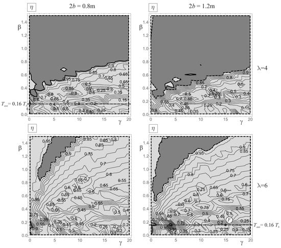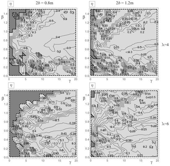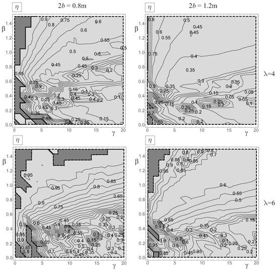 Figure 13 and Figure 14 show the gain maps obtained by exciting the coupled system with the Newhall and Christchurch seismic records, respectively. Both figures are arranged in matrix form with rows referring to different values of and columns referring to different values of , as in Figure 11. The maps shown in Figure 13 and Figure 14 refer to the same four blocks in Figure 11. For both seismic records, the advantage regions (the light grey ones) cover significant portions of the parameter plane , and the coupling assures a large reduction in of up to 80% in the corresponding for all the considered dimensions of the rigid blocks.