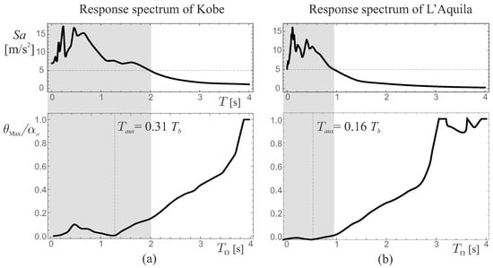 In general, the regions with minimum values of obtained with the L’Aquila seismic record correspond to smaller values of compared with those obtained with the Kobe seismic record. This occurrence can be explained by observing the response spectra of the two seismic records (right graphs of Figure 7a,b). The response spectrum of the L’Aquila seismic record is significantly narrower and shifted towards lower values of T than the response spectrum of the Kobe seismic record. Since the larger reduction in is obtained for periods of the external excitation close to , in the case of a seismic excitation, has to be tuned in the range of frequencies where the seismic record has the highest spectral power for the auxiliary system to be effective in protecting the rigid block.
