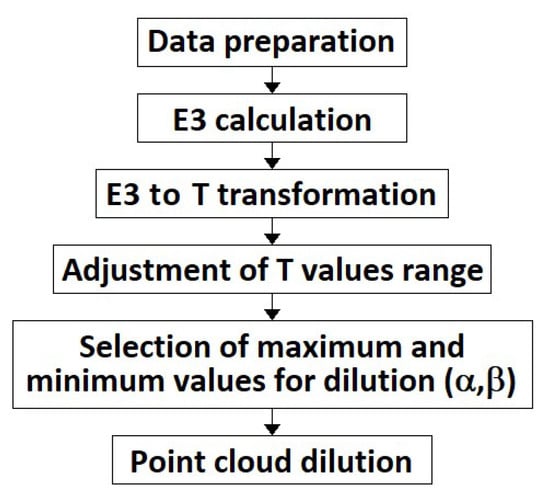The principle of the proposed method is quite simple. The point cloud representing the object’s surface contains a finite number of discrete points. The surface of flatter parts can be captured using much fewer points than curved or rugged surfaces. If we can, therefore, determine the “flatness” of the surroundings of the point, we can determine how much we can dilute the cloud in its vicinity without compromising the quality of the object description. The proposed method performs this in the unordered original point cloud using already known simple manipulations. Unlike the commonly used uniform dilution using only one parameter determining the distance between individual points in the diluted cloud (a), the proposed method adds an additional parameter (b), which defines the maximum distance between points, i.e., the distance that shall be used on the flattest surfaces. The method sequence is as follows (also shown on Figure 1):